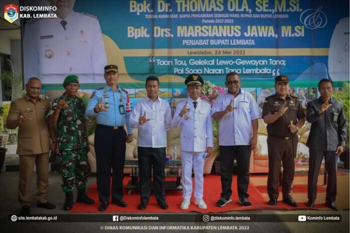Penjabat Bupati Lembata Marsianus Jawa berpose bersama Mantan Bupati Thomas Ola dan Forkompinda pada acara pisah sambut di kantor Bupati Lembata,Selasa 24/05/2022