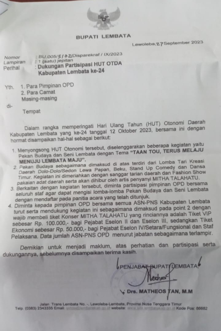 (Point 4) “Diminta kepada seluruh Pimpinan OPD bersama ASN-PNS Kabupaten Lembata, turut serta mendukung kegiatan Hari Ulang Tahun Otonomi Daerah dengan wajib membeli tiket konser Mitha Talahatu. Dengan rincian tiket VIP sebesar Rp. 100.000 bagi pejabat Eselon II dan Eselon III, sedangkan tiket ekonomi sebesar Rp. 50.000 bagi Esolon IV dan Staf Pelaksana”.